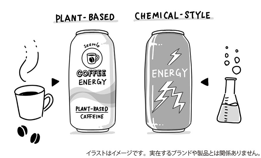 他方で、引き続きアメリカのスターバックスRTD商品を観察すると、発売後に消費者の支持を得たと思われる自社の強みを即時パッケージデザインに反映し、より明確に表現することでブランドが構築されていく様子が見て取れました。例えばエナジードリンクでは、カフェインにケミカルな印象のある他社品に対し、スターバックス商品はプラントベース(植物由来)であることを明確に表現し差別化を図っているように見えるとのことで、確かに、既にある実店舗や手淹れのコーヒーのイメージをうまくアドバンテージとして扱い、新たなカテゴリーを創出することでブランドを強固にしていく意図を感じました。