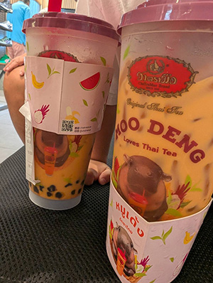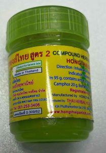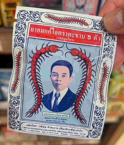例えば、1の写真はタイ人の愛好するヤードム(嗅ぎ薬)のパッケージです。タイ語、英語、中国語が使用されており、多国籍対応されていることがわかります。また、2の写真はタイで古くから愛されているという駄菓子の包装用容器ですが、ここでも英語がタイ語と併記されていました。