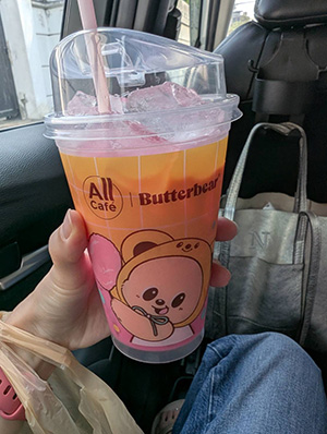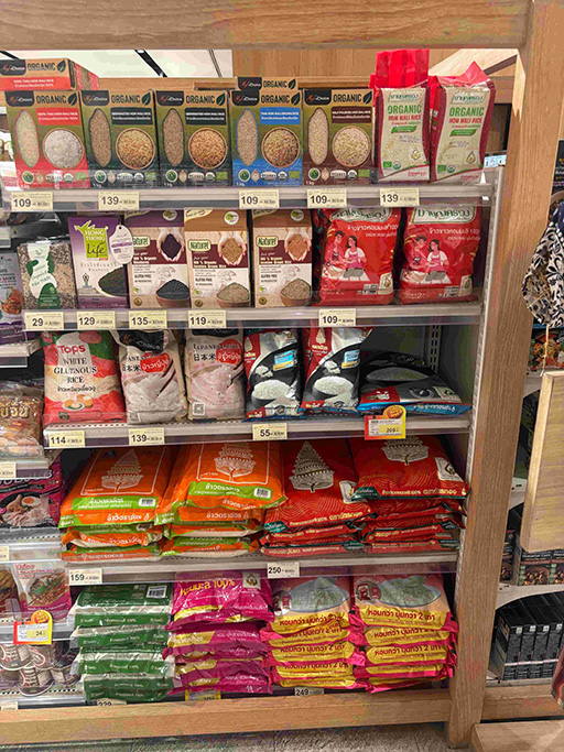 その他に、全体的な傾向として、赤色やオレンジ色等のカラフルなデザインや王室や寺院をイメージさせる象・金色・黄色が好まれている傾向があるように感じます。3の写真はスーパーのお米売り場の写真ですが、日本の売り場よりカラフルだと思います。タイ人は可愛いものが好きで、日本同様キャラクターが包装用容器に多く使用されているのも特徴的かと思います。4の写真はキャラクターとコラボした飲料のパッケージ写真です。