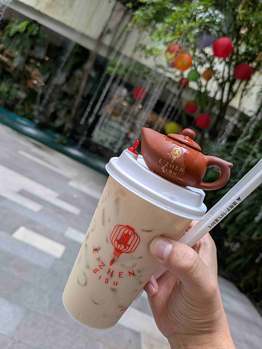 7.タイティーの容器。容器上部の急須にドライアイスと水を入れた状態で手渡され、立ち上る煙を見て視覚的にも楽しむことができる仕掛けになっている。(執筆者撮影)